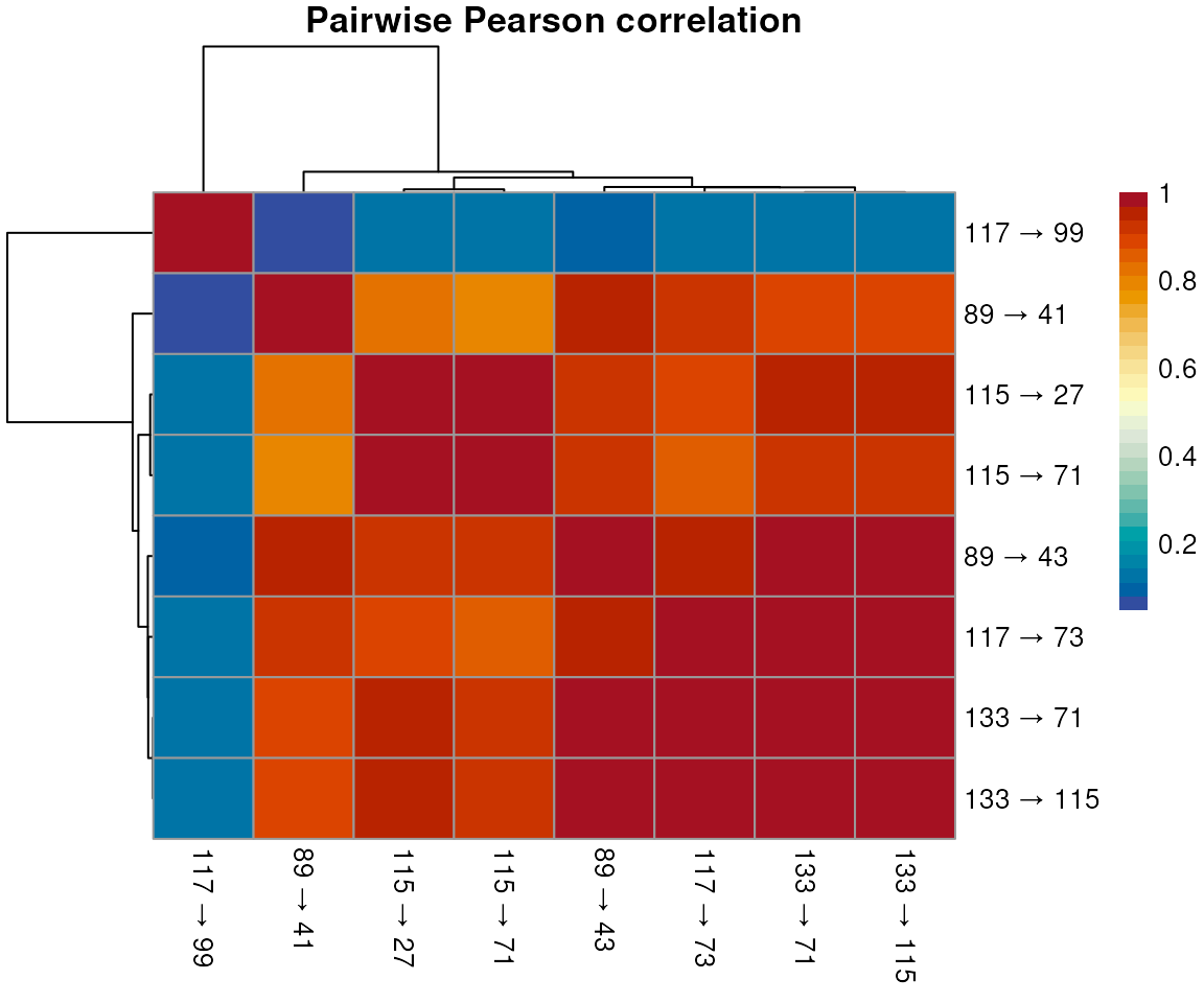 cor_strict <- compareChromatograms(chr_sub, minPeaks = 10L)