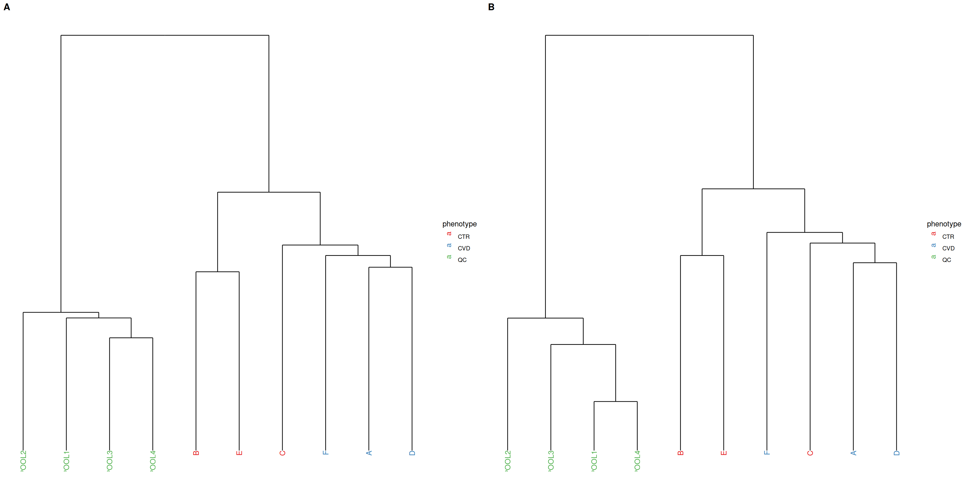 PCA and hierarchical clustering using Ward’s criterion are complementary unsupervised methods operating in Euclidean space. While PCA focuses on explaining the variation with maximally reduced dimensionality, hierarchical clustering allows observation of relationships between samples at higher resolution by minimizing within-cluster variation in the clustering of samples. Tighter clustering of QC samples is expected. Hierarchical clustering is generally more sensitive to noise than PCA.