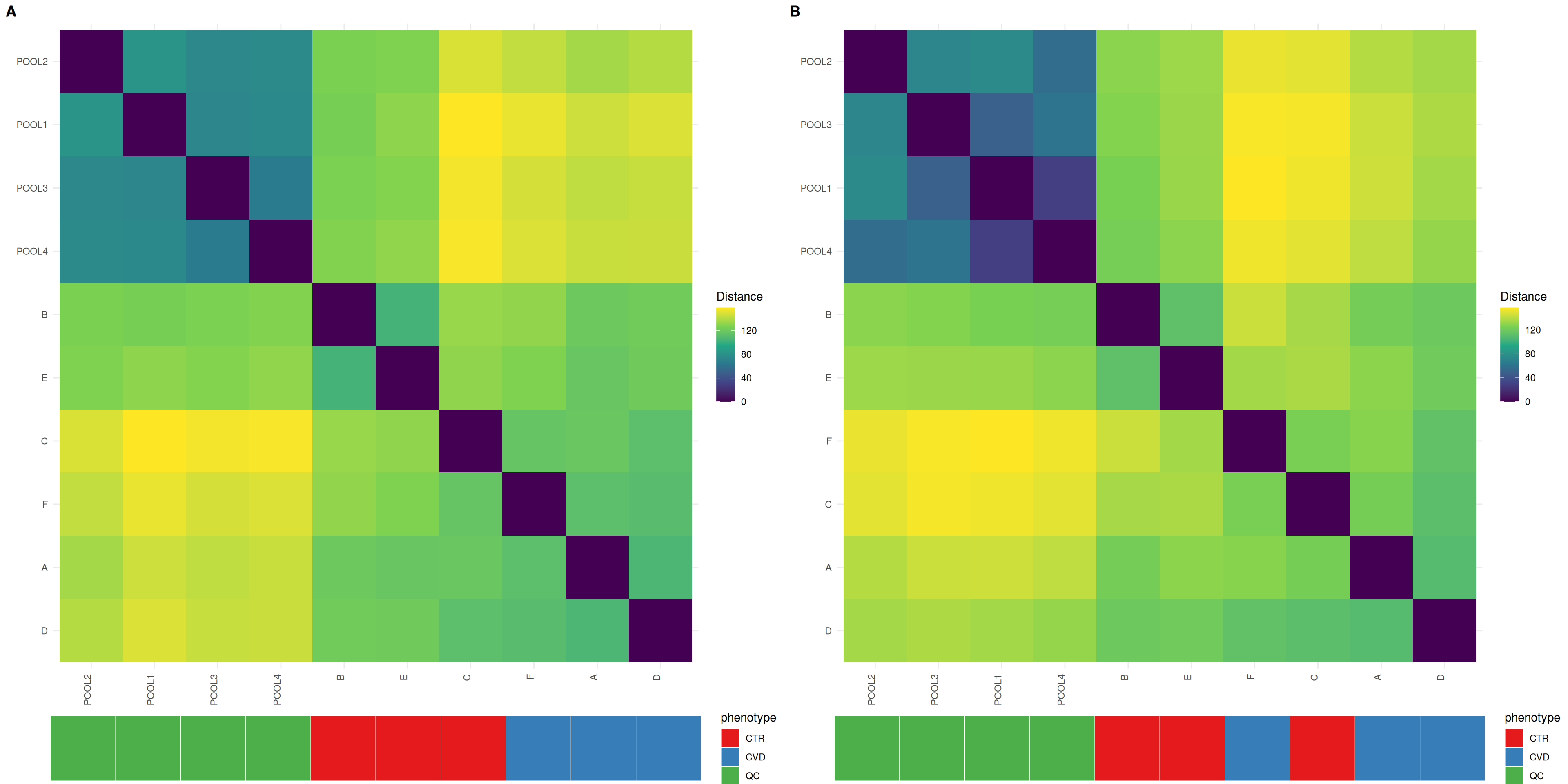 Heatmaps give insight into the actual distances between samples, where the distances between QC samples should be smaller after normalization. Organizing the heatmap as per hierachical sample clusters using Ward’s criterion facilitates interpretation. The QC samples should appear as a darker, more uniform square.