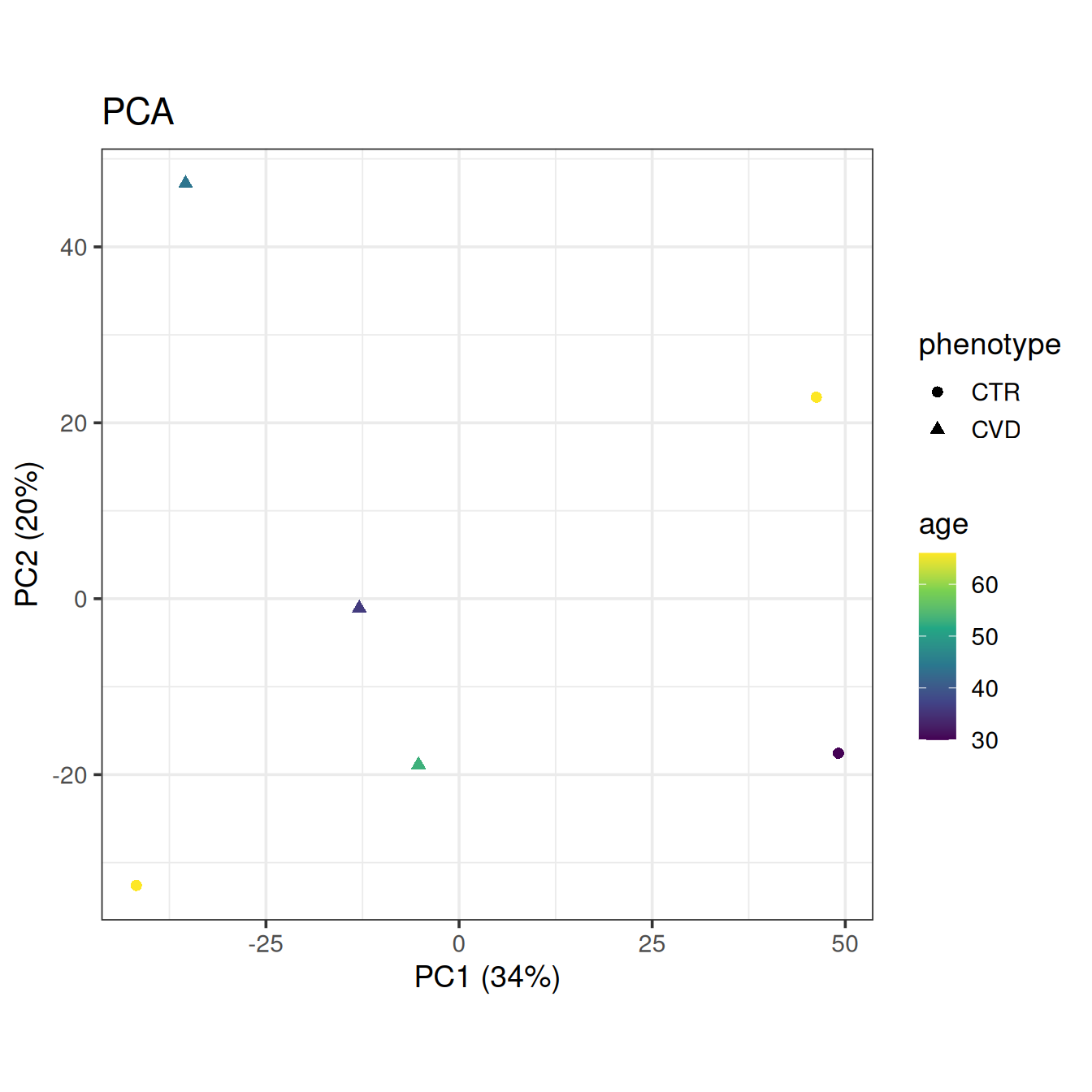 Let’s get a final look at the data with PCA, this time without QC samples and coloring by the only available clinical covariate, age.