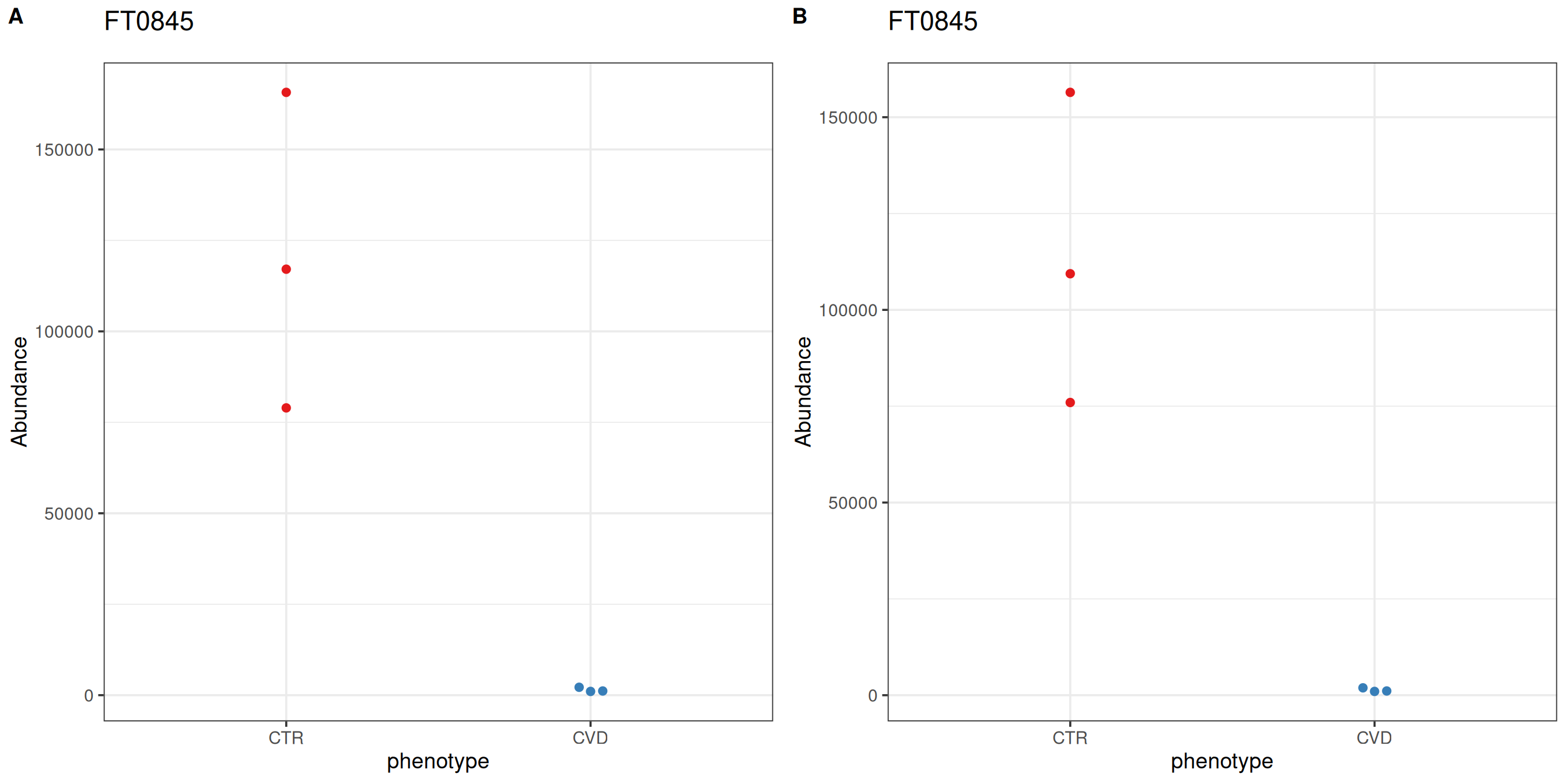 The results are also visualized with a variety of comprehensive visualizations. The volcano plot below shows that feature “FT0845” is distinct in having a low p-value and the second-largest fold-change. Manhattan plots and cloud plots could also be used to inspect how interesting features relate to m/z and retention time. We often co-visualize results from differential abundance analysis with a ranking of features from supervised learning for a combined perspective.