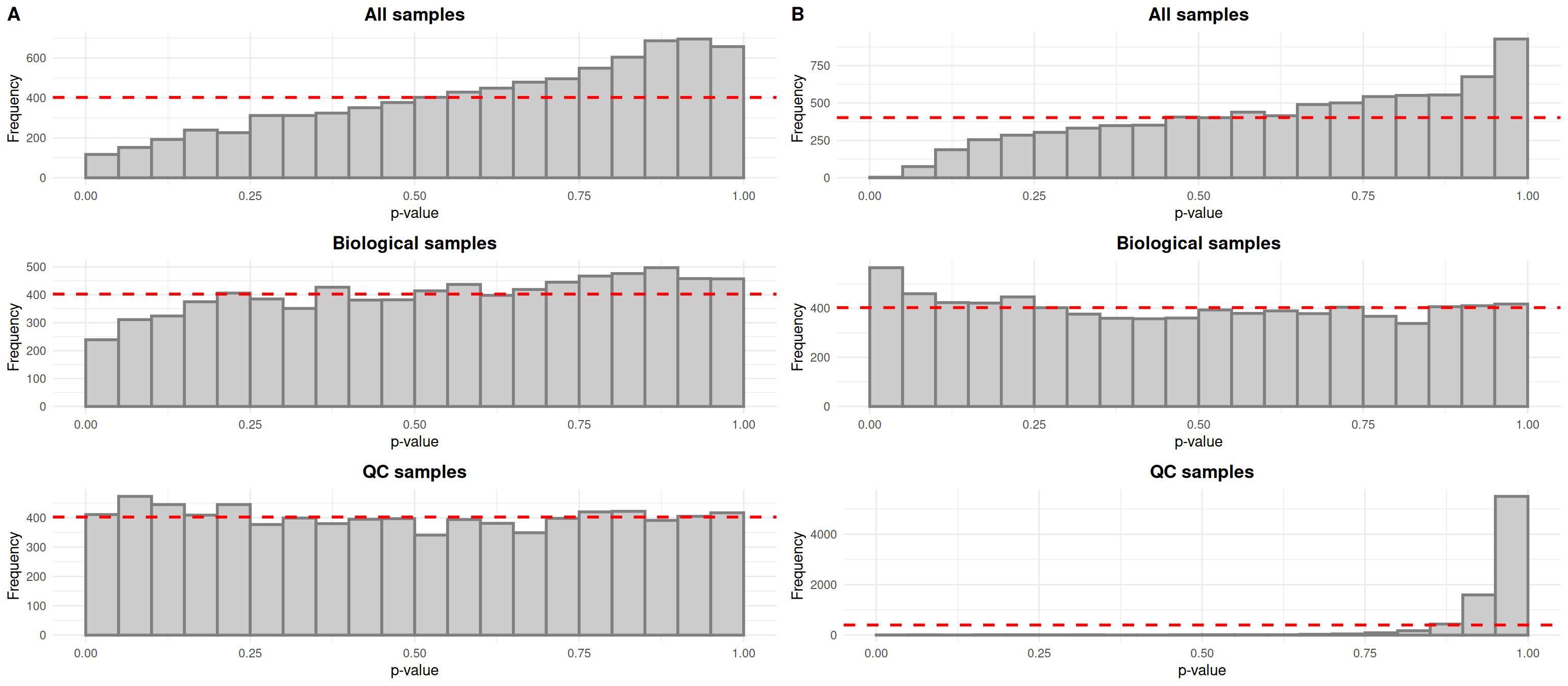Typically, drift in the biological samples would be evidenced by an overabundance of low p-values in histograms relating each features’ abundance to injection order. After drift correction, the distributions would be expected to be more uniform for all samples and biological samples. In the case of QC samples, an overabundance of high p-values is expected given that the QC samples are identical.