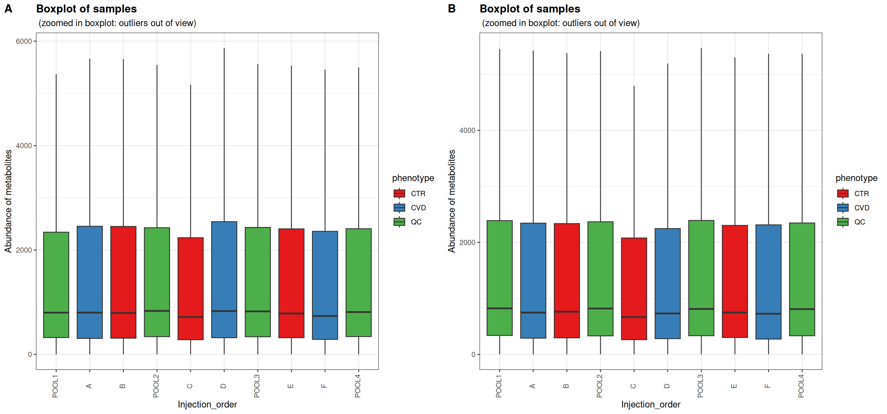 The normalization process is based on QC samples so the sample size here is limiting, with only four QC samples. The QC samples were also pooled from another sample collection, whereas typically, the QC samples would be pooled from the same sample collection. These limitations will become evident below, so we make an effort to explain the basic things one would want to look out for.