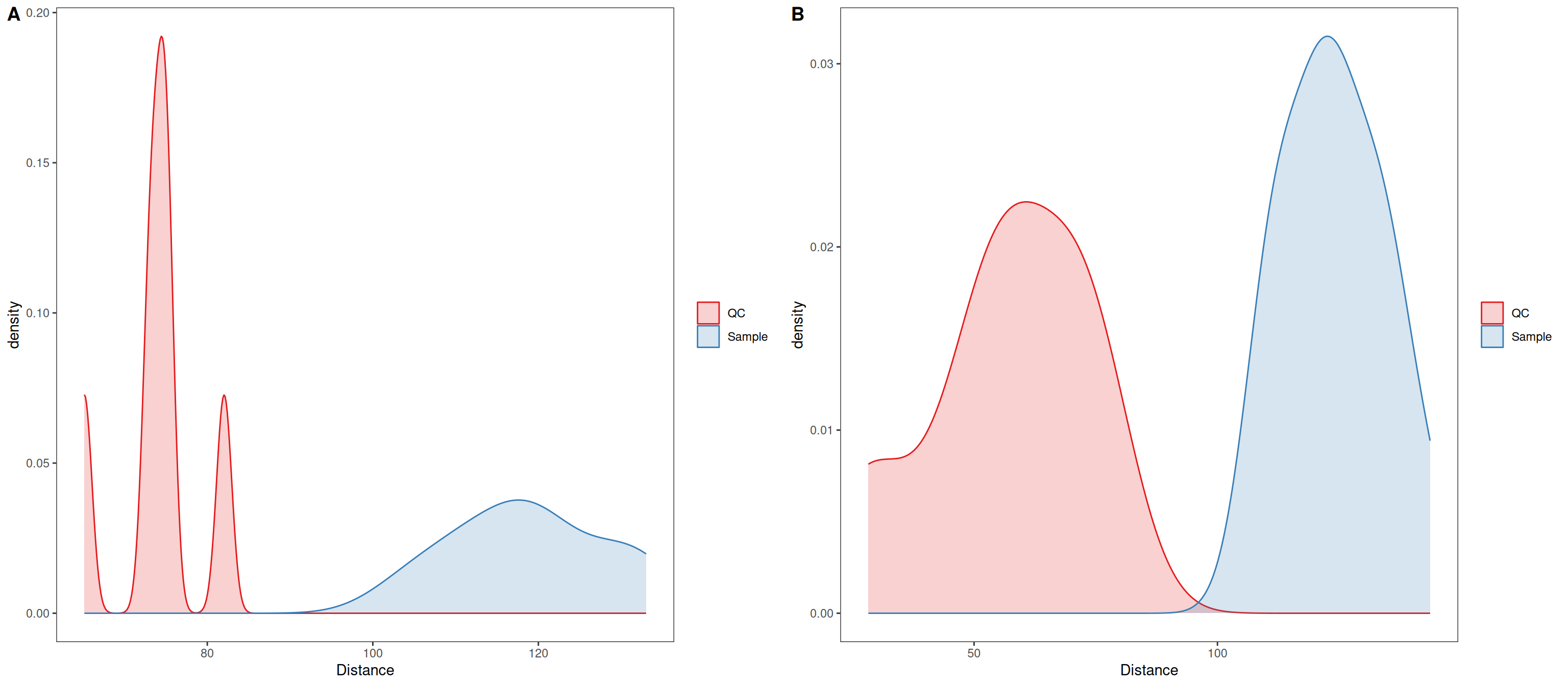 In distance density plots, one would generally expect a single prominent density peak for QC samples and greater separation between QC samples and biological samples after normalization, which also is the case herein. The separation between QC samples and biological samples has not increased, although in this case it may be an artifact from the sample size affecting the kernel density estimate.