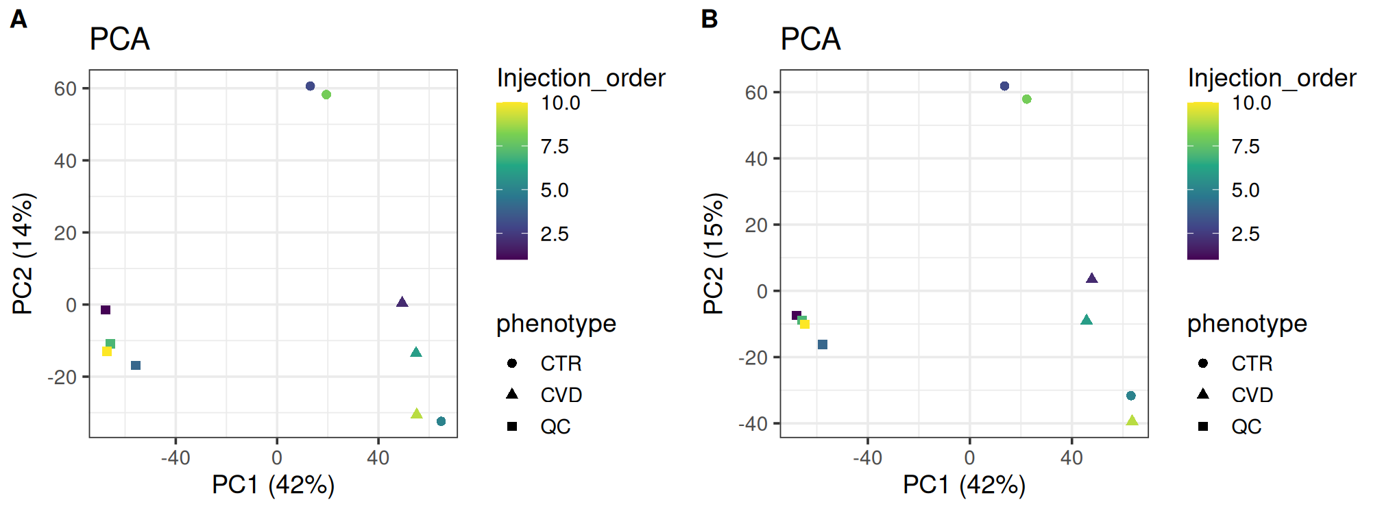 As expected, the overall structure is intact and the QC samples group more tightly, indicating that we have reduced unwanted variation. The CVD group seems to group more tightly after normalization; the opposite can be said for the CTR group. Such local differences could be investigated further using t-SNE and coloring for injection order. There is little difference in the variance explained by the first two components.
